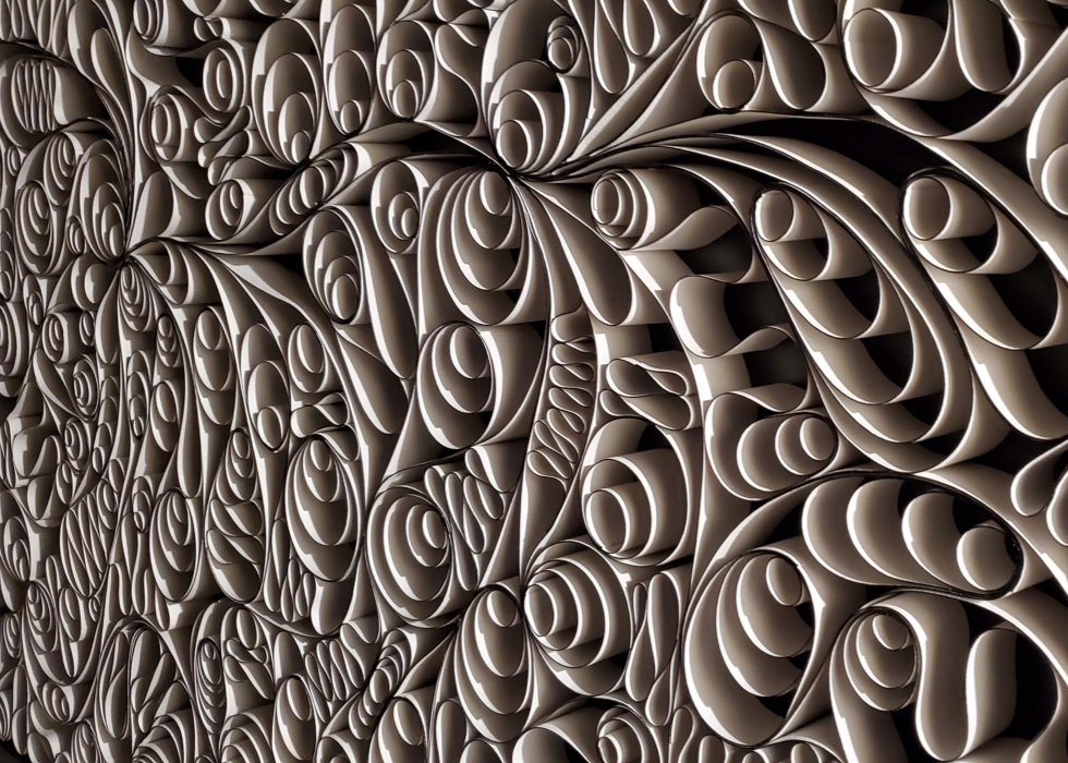 The canvas was cut into narrow stripes and then combined into a layered palette inspired by the patterns and shapes of nature.