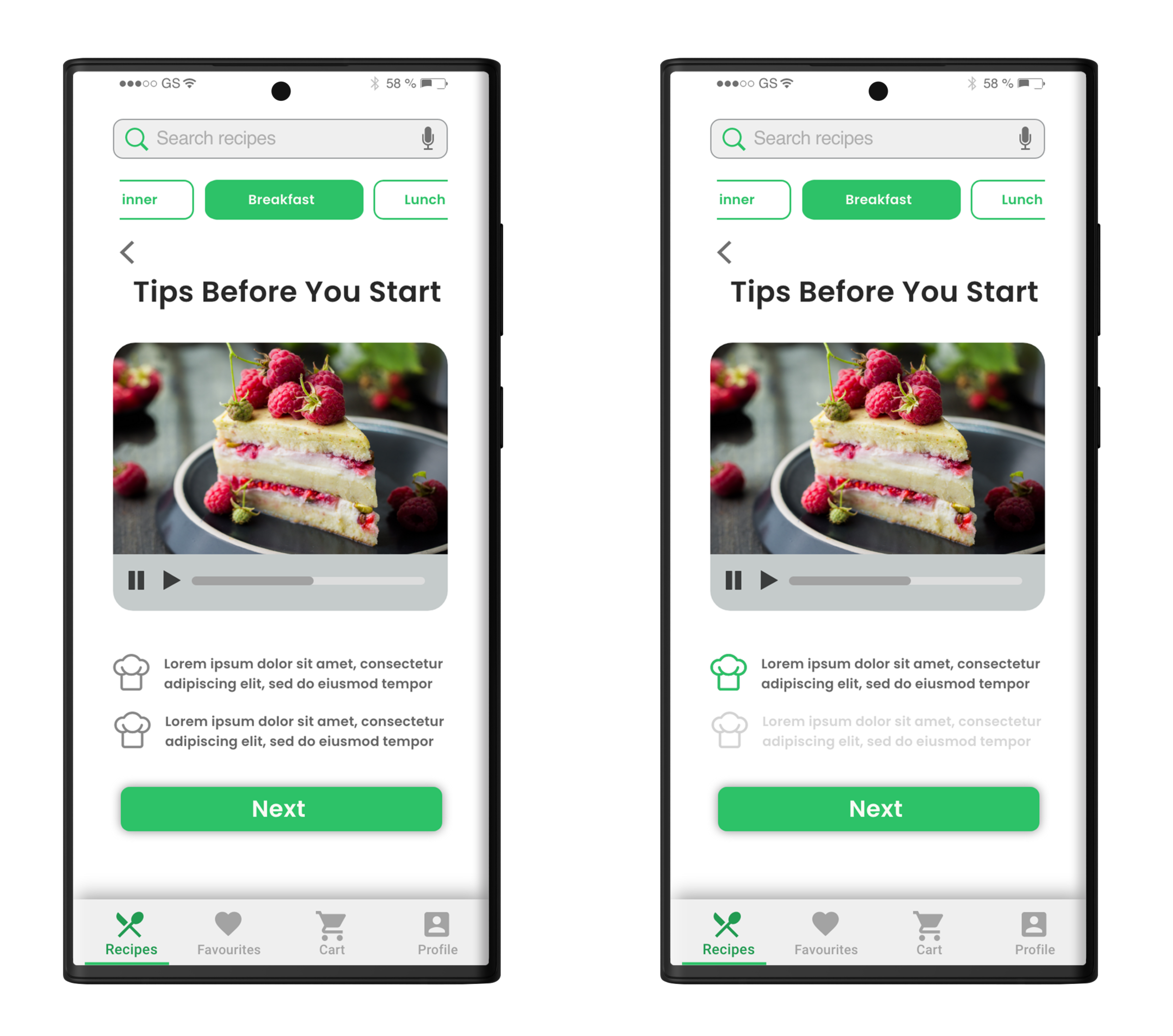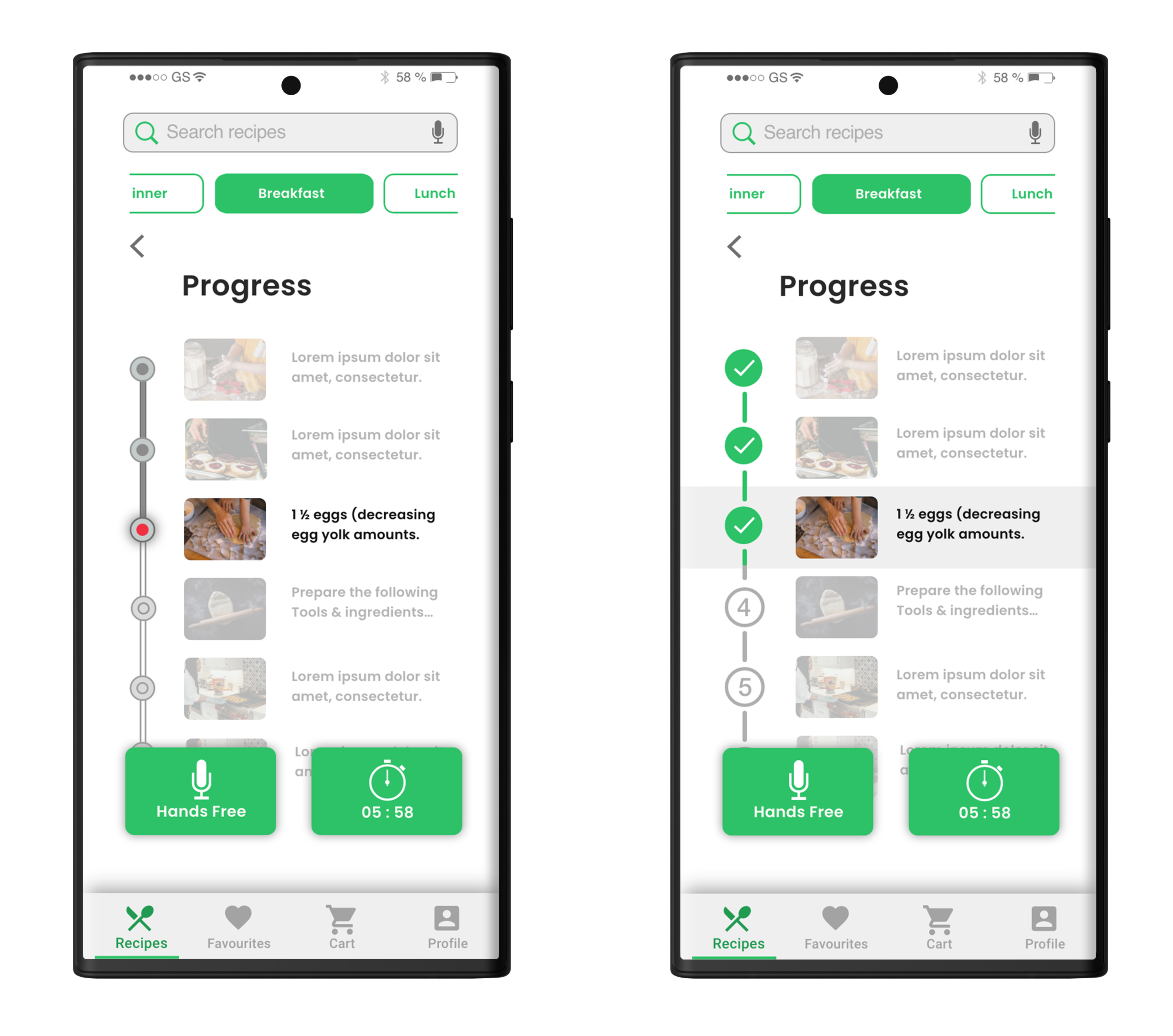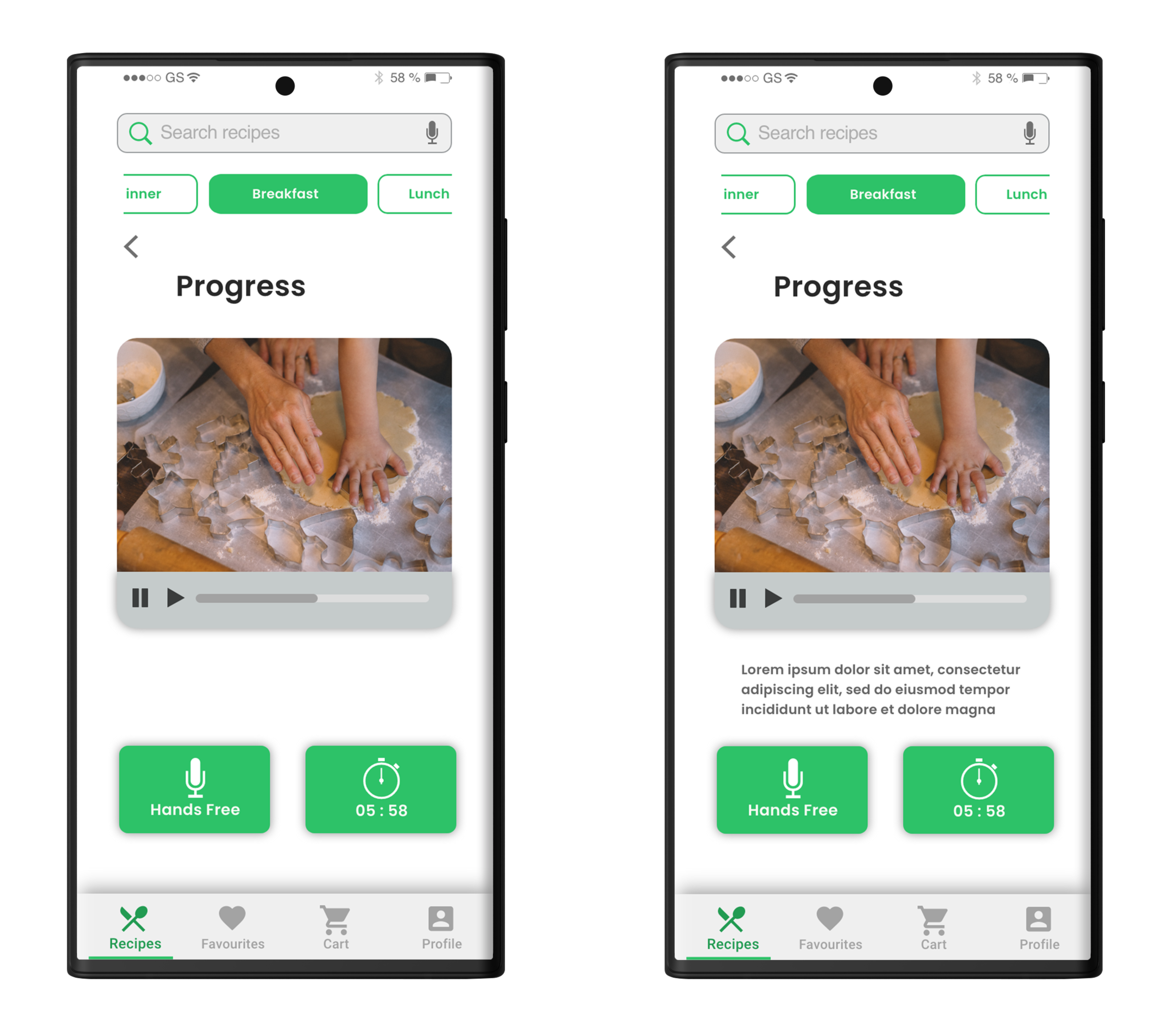 - Add an option to follow cooking steps presented as a text list, images with descriptions (to compare the current result with the expected result), or follow the steps with detailed video instructions.