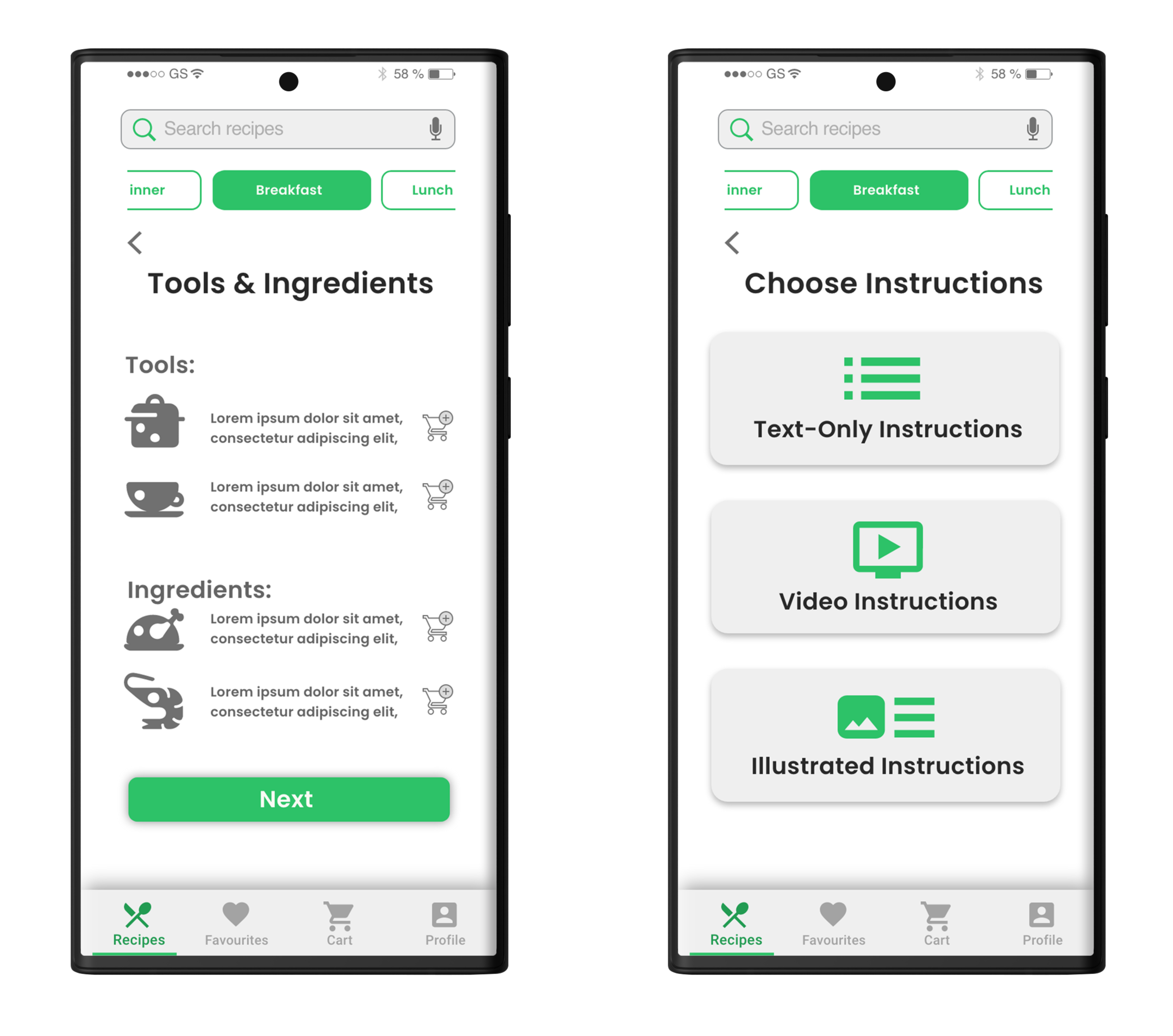 The user checks all the necessary tools and ingredients and if they are missing, he has the option to buy them. As the next step, the user selects the type of instruction: video, text or detailed images with comments.