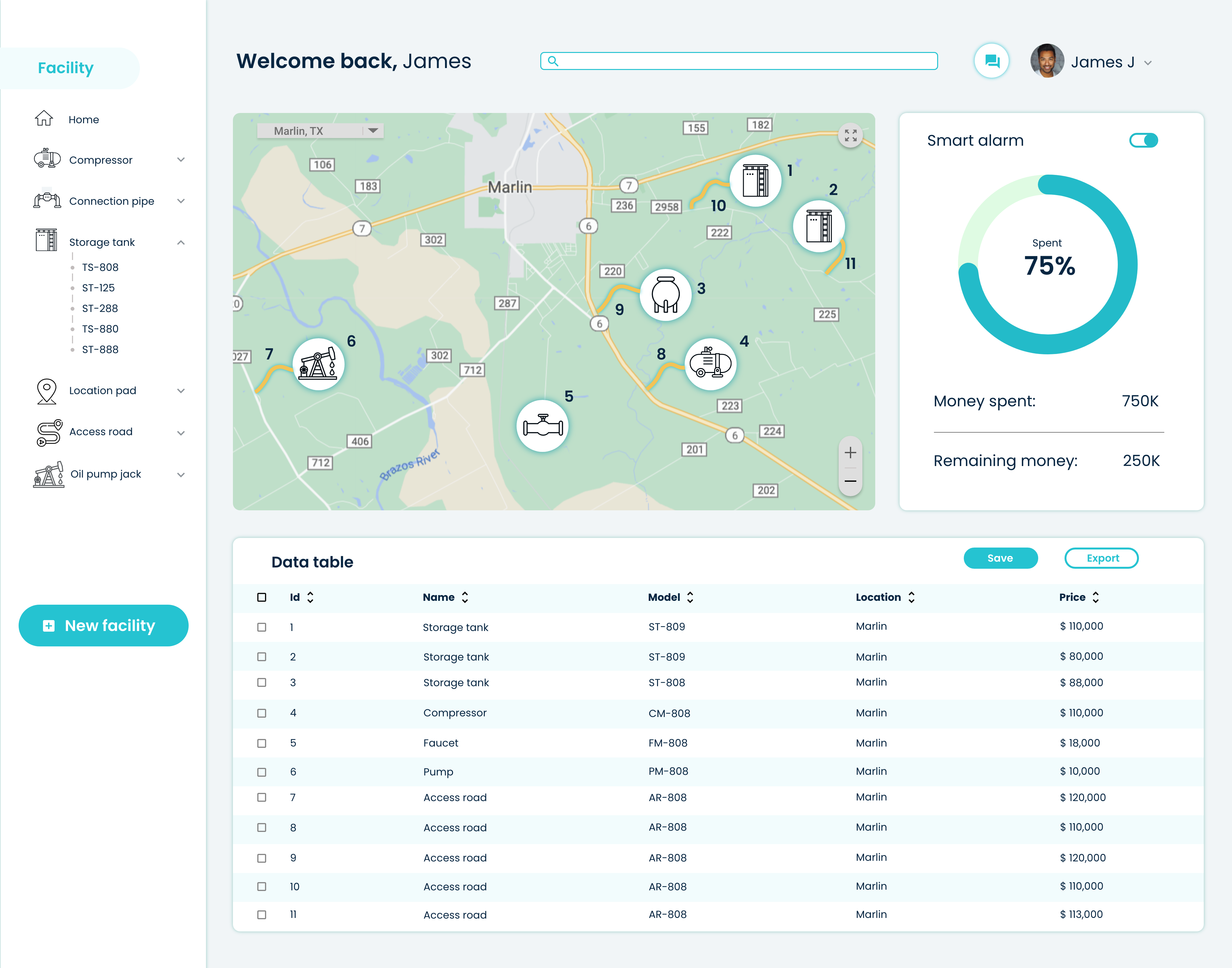“As a Facility Engineer, I want to build a new oil and gas facility using a custom map-based UI. I want to visualize where to place key components like storage tanks and compressors, track the total cost vs. budget, and export my plan as a data table for Accounting.”